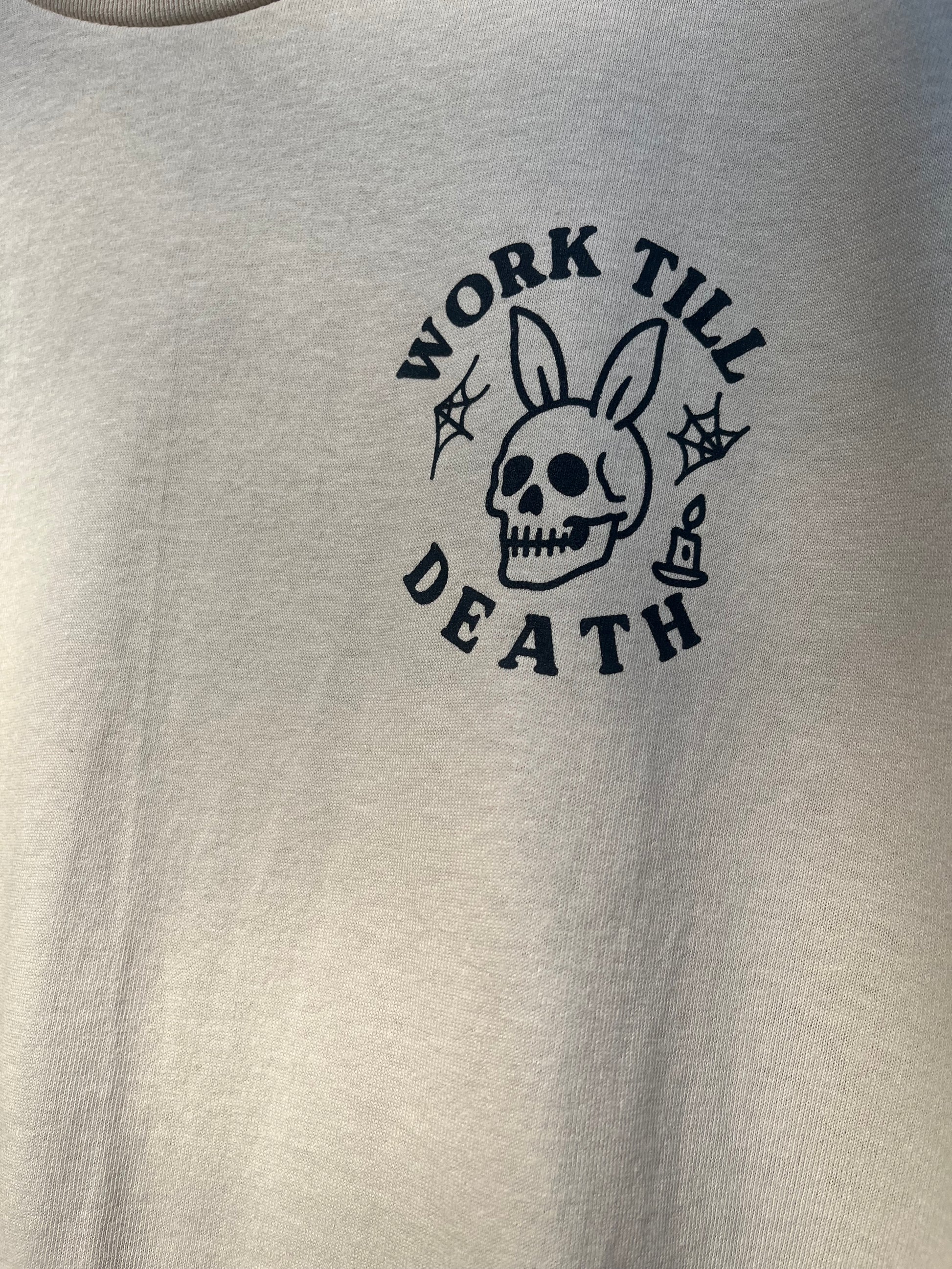Clock in, zone out. The Sad But Employed Tee captures the soul-sucking grind of the 9–5 — a skeleton stuck at the desk with nothing but a “Hang in There” sign and false promises of benefits after 90 days. Printed bold on a soft bone-colored blank, this shirt is part dark humor, part working-class reality.